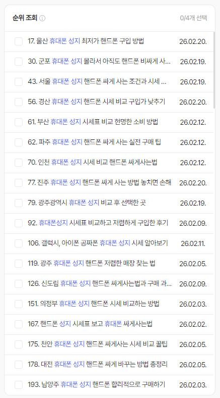 월간 검색량이 48,000 가량이고, 블로그 월간 발행량이 19,500건인 ‘휴대폰 성지’의 경우, 아래, 디랭크의 순위조회 결괏값으로 보면, 매일 2~3건의 포스팅을 하고, 그 글들이 아래와 같이 포진됩니다.