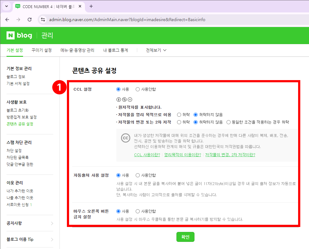 내 블로그 – 관리 – 기본 설정 – 콘텐츠 공유 설정으로 이동합니다.