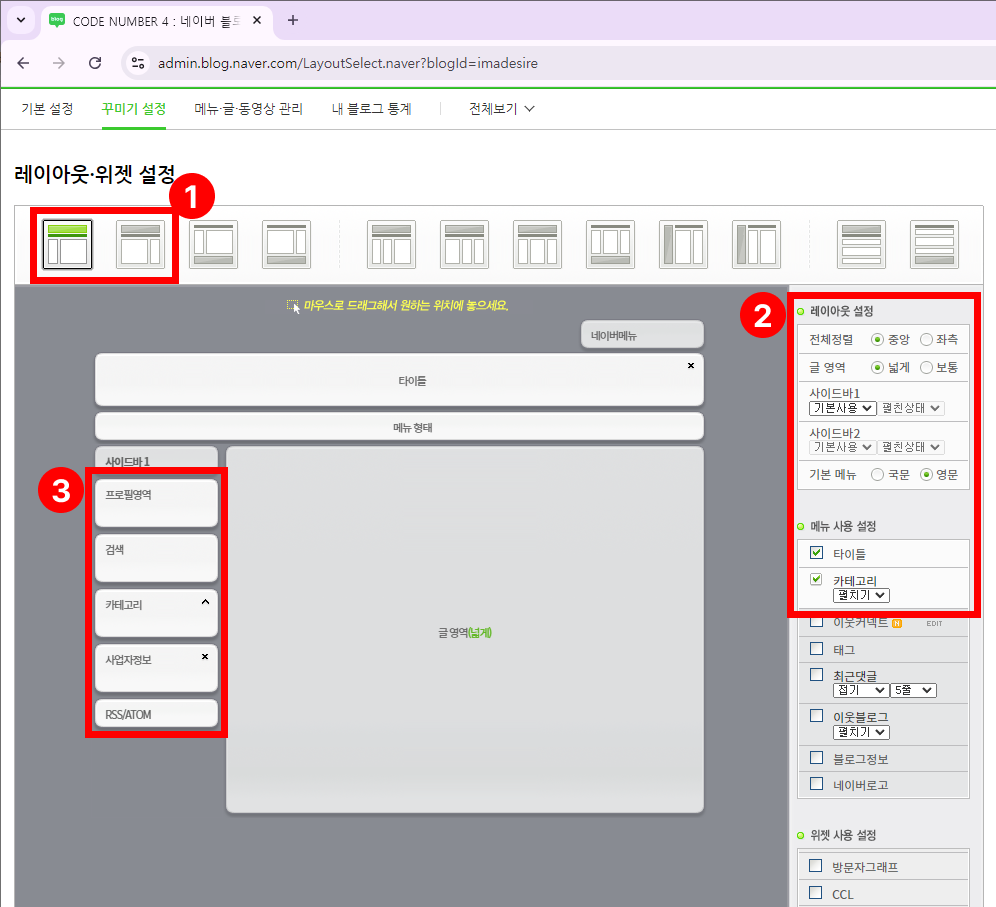 내 블로그 – 관리 – 꾸미기 설정 – 레이아웃·위젯 설정으로 이동합니다.