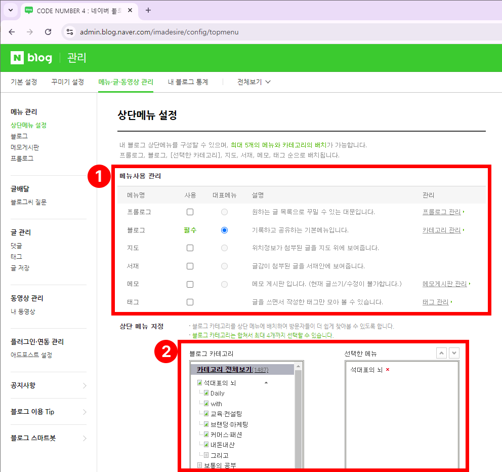 내 블로그 – 관리 – 메뉴·글·동영상 관리 – 상단메뉴 설정으로 이동합니다.