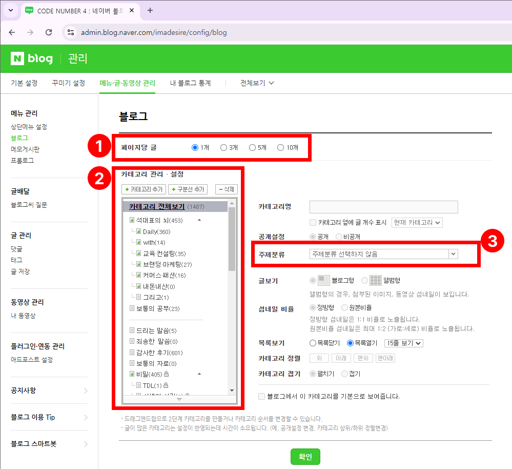 ① 페이지당 글은 무조건 1개로 설정하시는 것이 좋습니다.